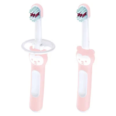 MAM Baby's Brush Pack of 2, Baby Toothbrushes With Safety Shields, Ideal for Teaching Dental Hygiene to Infants, Toothbrush Babies, Suitable From Birth, Pink (Designs May Vary)