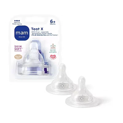 Babies love the SkinSoftTM Teat because it feels so soft and familiar, just like a mother's skin which makes switching between breastfeeding and bottle especially easy. Proven effect: 94%* of babies accept the MAM Teat. The symmetric shape fits perfectly in babies mouth and because MAM offer a number of different flow rates to perfectly suit whichever stage your baby is at. Teat size X is perfect for 6 months+ and particularly suitable for thicker liquids. Teats must be replaced every 1-2 months for safety and hygiene reasons. *Market research 2009- 2017, tested with 1,508 babies.