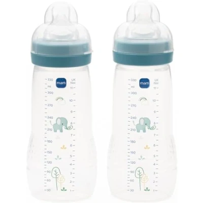 MAM Easy Active Baby Bottle with Fast Flow Teats Size 3, Twin Pack of Bottles, Feeding, 330 ml, Blue (Designs May Vary)