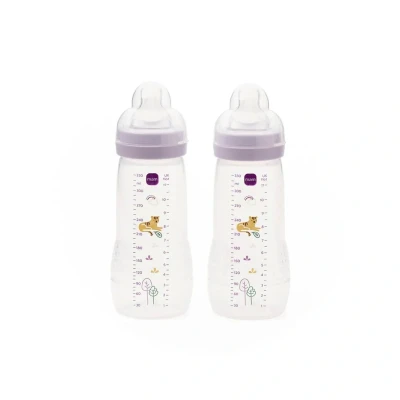 MAM Easy Active Baby Bottle with Fast Flow Teats Size 3, Twin Pack of Bottles, Feeding, 330 ml, Colour: Pink (Designs May Vary)