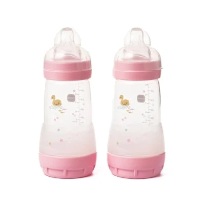 MAM Easy Start Self Sterilising Anti Colic Baby Bottle Pack of 2 (2 x 260 ml), Bottles with Medium Flow Teats Size 2, Newborn Essentials, Pink (Designs May Vary)