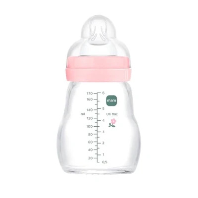 MAM Feel Good A160 Premium Glass Bottle with Teat 1 Patented SkinSoftTM Ultra Soft Silicone for Babies 0 Months + 170 ml Pink