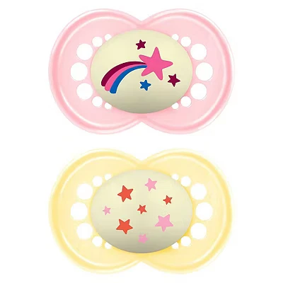 MAM Original Night Soother 16+ Months (Pack of 2), Sustainable Baby Soother, SkinSoft Silicone Teat, Glow in the Dark Pink (Designs May Vary)