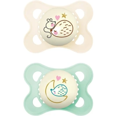 MAM Original Night Soother 2 6 Months (Pack of 2), Sustainable Baby Soother, SkinSoft Silicone Teat, Glow in the Dark Cream (Designs May Vary)
