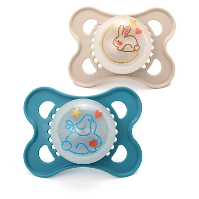 MAM Original Pure Night Soother 2 6 Months (Set of 2), Sustainable and Bio Renewable Baby Soother, SkinSoft Silicone Teat, Glow in the Dark Blue/Cream (Designs May Vary)