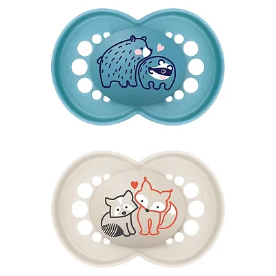 MAM Original Soother 16+ Months (Pack of 2), Baby Made from Sustainable Material, SkinSoft Silicone Teat, with Case, Blue (Designs May Vary)