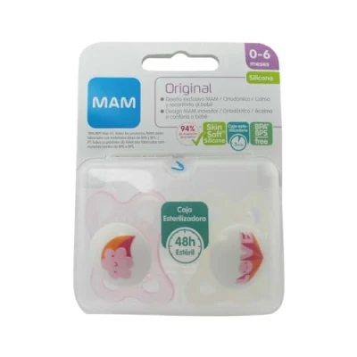MAM Spain product with instructions in Spanish SkinSoftTM patented ultra-soft silicone teat accepted by 94% of babies* thanks to its soft and skin-friendly feel *Market study 2010-2019 tested with 1,463 babies Symmetrical teat. so he he always perfect in his Fits the mouth and supports the development of baby's jaw and teeth Symmetrical shield that adapts perfectly to the mouth and nose so that it is always well positioned and also provides ventilation openings to promote the breathability of the skin. International products have separate terms, are sold from abroad and may differ from local products, including fit, age ratings, and language of product, labeling or instructions.