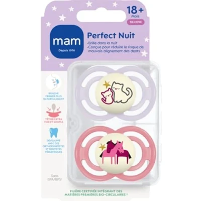 Optimal development: The Perfect Nuit mam soother allows the correct oral development of your baby. It is designed to reduce the risk of misalignment of teeth Innovative teat: The silicone teat is extra thin and flexible so that baby can close their mouth more naturally. Unique softness patented by mam. Accepted by 94% of babies* Glow in the dark: with its glow button, the Nuit mam dummy is very practical because it glows in the night and is easy to find in the dark Easy sterilisation: The Perfect Nuit mam dummy comes in a transport and sterilisation box. Sterilization is easy in 3 minutes in the microwave Practical details: Box of 2 silicone pacifiers mam Perfect Nuit 18+ months Animals. Random colour. BPA/BPS free. Made in Europe. Cardboard + recycling box in the sorting tray