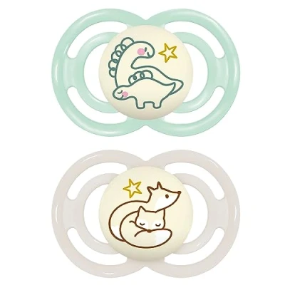 MAM Perfect Night Dummy Set of 2, Glow in the Dark, Tooth Friendly Baby Made from Sustainable & Organic Renewable Materials, with Box, 16+ Months, Dino/Fox