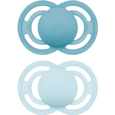 Mam Soother Perfect 6+ Months 2 Packs provide orthodontic, dentist-developed pacifiers with an extra-thin, soft silicone teat for healthy dental development. Includes a self-sterilising travel case, is gentle on skin with ventilated shield, and made from sustainable, BPA/BPS-free materials for babies 6+ months.