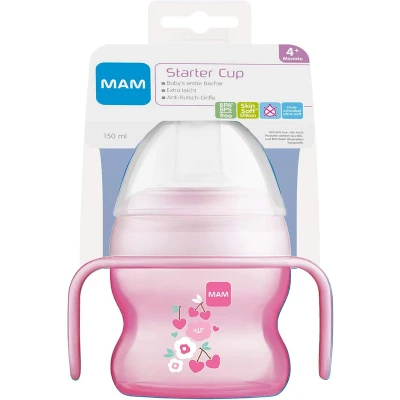 MAM Starter Cup and Handles with 0+ Months Start Soother, Baby for 4+ months, Feeding, 1x 150 ml, Pink (Designs May Vary)