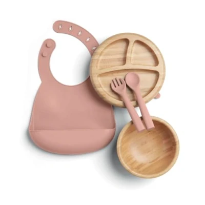 Mamas & Papas 4 Piece Bamboo Weaning Starter Kit Baby Plate and Bowl with Suction, Cutlery Adjustable Bib for Ages 6 18 Months Melba