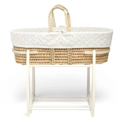 Basket woven from natural palm Lined with a cosy cable knit liner Neutral colours to complement any interior style Maximum weight of the child: 9kg. Covers - Machine washable Base Dimensions: L76 x W30cm Upper Dimensions: L86 x W42 x H26cm Basket - Palm Main - 100% Cotton Lining - 100% polypropylene Fitted Sheet: 100% Cotton