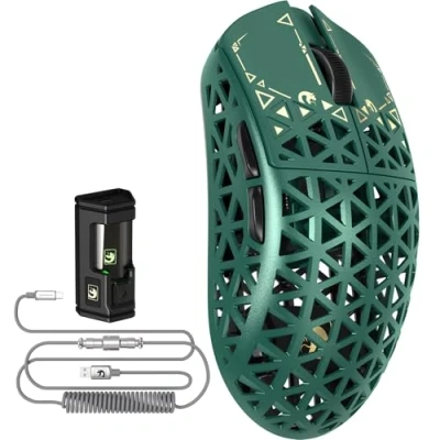 【Ultra-Lightweight Carbon Fiber Shell – 39g Revolution】Unleash unparalleled agility with the M5 Ultra’s aerospace-inspired carbon fiber composite shell, meticulously engineered to achieve an astonishing 39g (±3g) weight without sacrificing durability. This groundbreaking design outperforms competitors, weighing 33% lighter than the G Pro X and 23% leaner than the V3 Pro, making it the ultimate weapon for FPS, MOBA, MMO, and battle royale games where every millisecond counts. 【PAW3950MAX Flagship Sensor – Precision Redefined】Dominate with PixArt’s cutting-edge PAW3950MAX optical sensor, boasting a staggering 42,000 DPI, 8,000Hz polling rate, 750 IPS tracking speed, and 50G acceleration. Engineered for esports pros, it delivers pixel-perfect accuracy, zero latency, and flawless motion sync – whether you’re executing sniper flicks, tracking strafing enemies, or dodging skill shots at lightning speed. 【8,000Hz Wireless HyperPolling – Latency Obliterated】Experience 0.125ms response times with our industry-first 8,000Hz wireless technology, offering 8X faster input processing than standard 1,000Hz gaming mice. Say goodbye to input lag and hello to instantaneous trigger reactions, giving you a decisive edge in clutch moments where split-second decisions determine victory or defeat. 【SMARTSPEED Tri-Mode Connectivity – Uninterrupted Domination】Switch seamlessly between ultra-responsive 2.4GHz wireless (200-hour battery life), Bluetooth 5.2, and wired USB-C modes without compromising performance. Our adaptive frequency-hopping tech eliminates interference, while smart power management ensures you stay in the fight through marathon gaming sessions. 【100M-Click Switches – Tactile Perfection】Equipped with legendary Japanese microswitches rated for 100 million clicks, the M5 Ultra delivers crisp, consistent actuation for rapid-fire commands. Paired with an F-Switch encoder scroll wheel, enjoy hyper-accurate tactile feedback during weapon swaps, inventory scrolling, or ability executions.