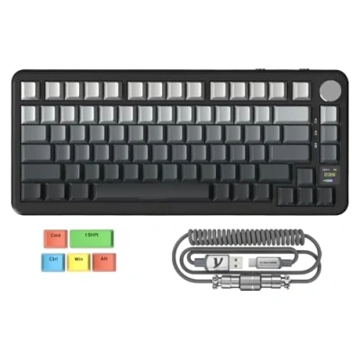 【75% ANSI Layout & Upgraded Gasket-Mount】Adopt the most popular 75% AINSI layout,making it practical choice for work/gaming. Fully equipped internal filling structure. Built-in 5 layers sound absorbing foams,including: PORON Sandwich Cotton,8 × IXPE Switch Pad,PET Sound Absorbing Foam,Sponge Case Foam,Bottom Silicone Pad.Noise is maximally reduced,It achieve an ultimate soft,pure sound and smooth typing experience. 【Multi-Function TFT Smart Display and Knob Design】X85PRO gaming keyboard built-in smart TFT color display can intuitively display the keyboard status, including custom gif image,connection mode, WIN/MAC, battery,Lighting,volume.Built-in mechanical knobs allow quick adjustment of complex functions:volume adjust ,modes switch,screen control.Customize the screen and knobs to bring you more fun. 【Triple Connection Modes & Multi-Device Tasking】The X85PRO supports Bluetooth or 2.4Ghz for wireless connectivity,or with the USB-C cable.With Bluetooth 5.1,the keyboard responses faster and save more power than the former Bluetooth versions.It is also easily switched among the three modes for efficient multitasking.Included 4000mAh battery ensures a long use. 【Hot-swappable & Single key Slotted Design】1.2mm PCB adopts leading ENIG technology.It supports 3/5-pin hot-swappable,with Linear pre-lubed blueberry switch,so you can enjoy the fun of making your own keyboard.Adopt single key slotted PCB design,improve key stability and input experience,accurately position and press the key,prevent the key bounce and mistouch,greatly improve the sensitivity and response speed of the keyboard. 【PBT Side-Printed Keycap & South-facing RGB】X85 keyboard comes with PBT Side-Printed Keycaps in Cherry profile and gradient Keycap Desgin,It has clearly visible transparent letters.The south-facing RGB is designed to better illuminate the keyboard backlight from the typist’s angle and free from interference while changing the switches. 【Support QMK & Compatible with Mac/Win】Programming in QMK Web Driver: https://qmk.top/. The custom keyboard support QMK web driver .The RGB mode, Key setting, Macro and Gif image display settings of the keyboard can be fully customizable. It is fully compatible with both Mac and Windows systems,ensuring that you can enjoy the full range of its features irrespective of your computing preferences. 【With Pro Coiled Keyboard Cable & PBT Colorful Keycaps】For FPS Gamers and Efficient Working: with extra coiled keyboard cable.TPU double-sleeved USB C cable for mechanical keyboard,with detachable 24K Gold- aviator connector,which can achieve safer&faster charging and more efficient data sync up.Colorful PBT Keycaps add more fun elements to your desktop setup and makes your keyboard look great!