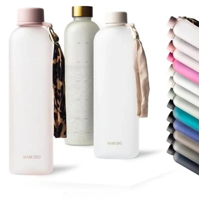 Timeless Design - It's our passion to create beautiful products. Our big water bottles feature unique styles, clean lines & simple elegance. A perfect small and light accessory that will draw everyone's attention. Premium Quality - Precisely manufactured from thermoplastic quality plastic Tritan Copolyester, our drinking bottles are neutral in taste and odour & robust. All materials used are suitable for food contact in accordance with EU regulations. Drink Enough - Was never so easy! With your new MAMEIDO gym water bottle you always have enough water or other drinks with you. The practical time markings on the back serves as a drinking reminder - a quick glance at the watch shows you whether you've had enough to drink. Stylish Accessory - 9 cool shades in a semi-transparent frosted glass look, elegantly lacquered screw caps & matching fashionable carrying straps. It doesn't matter whether you're doing sports, in the office/at home or on the go - with MAMEIDO you make the difference! Easy to clean - Our water bottle can be cleaned effortlessly with a bottle brush and remains durable and hygienic. The lid and hand strap can be easily removed and cleaned separately by hand.