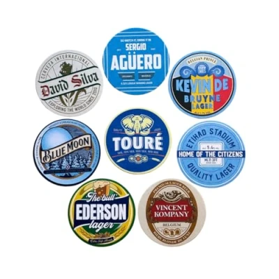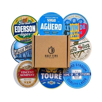 BUNDLE OF 8 - A must-have for any Manchester City fan! Get 8 Man City inspired beer mats - perfect for displaying your support for the team at any party or gathering. Show your allegiance with The Citizens with these MCFC themed beer mats. PERFECT PRESENT - Surprise your favourite Man City fan with these Beer Mat Coasters! A unique and thoughtful gift they'll love. Making a great stocking filler. GIFT PACKAGED - Arriving in a premium gift box ensuring your beer mats come in perfect condition, hassle-free. PREMIUM PULPBOARD - This beer mat set is made of a durable, high-quality, thick, absorbent pulpboard that'll make any footy fan proud. Perfect for keeping your drinks and tables safe. UNIQUE DESIGNS - Indulge in a relaxed and nostalgic vibe as you enjoy your favourite drink, surrounded by the iconic players, club songs, and historic moments that define the team's legacy.