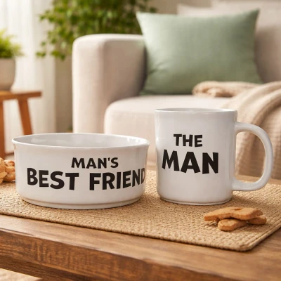 Brighten your mornings with the delightful pairing of 'The Man' mug and the 'Man's Best Friend' bowl. This charming duo isn’t just practical; it adds a sprinkle of joy to your coffee sips and your pup’s meals, transforming each day into a playful adventure. Whether it's your morning brew or your dog's dinner, enjoy special moments together that make every snack time heartwarming and memorable. Crafted with style in mind, this mug and bowl set showcases whimsical messaging that brings smiles to your face and cheer to any kitchen décor. The sturdy materials ensure they’re ready for everyday use, making them the ultimate companions for enjoying that warm cup of coffee while your furry mate digs into their feast. It’s a vibrant addition that radiates fun while keeping practicality at the forefront. Ideal for dog lovers, this thoughtful gift celebrates the unique bond between pets and their humans. Whether for yourself or as a delightful present, this duo encapsulates the essence of companionship, ensuring every meal and coffee break is a stylish affair. Brighten up your home accessories with this fabulous set that truly embraces the joy of sharing life with your canine companion!