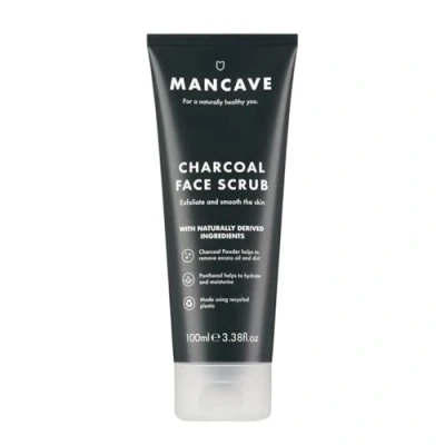 DEEP CLEASNING FACE SCRUB: ManCave Charcoal Face Scrub is a powerful scrub formulated with charcoal to deeply cleanse and exfoliate your skin, removing impurities and dead skin cells for a refreshed and revitalized complexion. VEGAN FRIENDLY + CRUELTY FREE 🌿 MADE IN THE UK 🇬🇧 CHARCOAL DETOXIFICATION: Infused with activated charcoal, this face scrub helps to draw out toxins and excess oil from your pores, promoting a clearer and more balanced complexion. Experience the detoxifying benefits of charcoal for healthier-looking skin. GENTLE, EFFECTIVE EXFOLIATION: The fine particles in our face scrub provide gentle exfoliation, effectively removing dead skin cells and promoting cell turnover. Enjoy the smooth and refined texture as it reveals brighter and more radiant skin. NOURISHING AND SOOTHING: Enriched with natural ingredients like Willow Bark Extract and Vitamin E, our face scrub nourishes and soothes your skin. Experience the hydrating and calming properties of these ingredients for a comfortable and refreshed feel after each use. PACKAGING MADE USING POST-CONSUMER RECYCLED PLASTICS (PCR) - The packaging of all our tubed and bottled products are made from Post-consumer recycled plastics meaning we're able to give plastics a second life. Not only is this product made from recycled plastics, but it can also be 100% recycled without having to take off labels or lids.