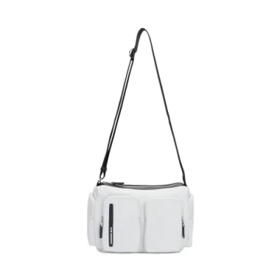Shiny nylon crossover with faux leather details and contrasting ribbon straps. This model features a large main compartment with spaces for small items and internal pockets and convenient front and side zip pockets for functionality and security.