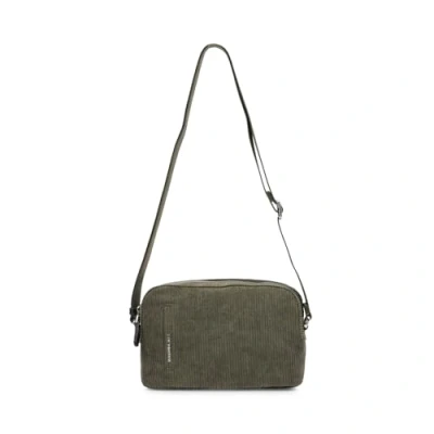 Compact corduroy crossover with double zip for access to the two main compartments, zipped back pocket, organized interiors and ribbon shoulder strap.