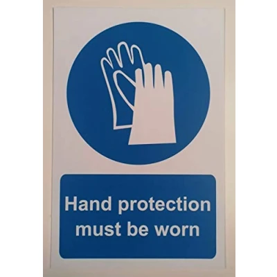 Mandatory sign hand protection must be worn Self adhesive sticker 200mm x 150mm Remove backing film and apply to dry, smooth, oil free surface. Digitally printed and laminated for extra durability, Manufacturer: KPCM Display