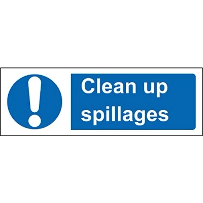 Mandatory signs Clean all spillages Safety sign Self adhesive sticker 150mm x 50mm