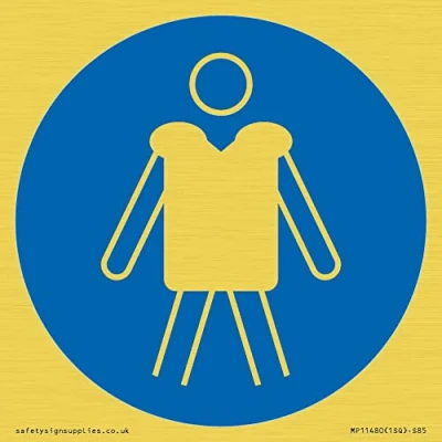 M053 : Wear personal flotation devices This sign is made from vinyl gold sticker Gold metal effect sticker for flat, clean surfaces. Not for rough, plastic, or dusty surfaces. S85 square Sign Text: