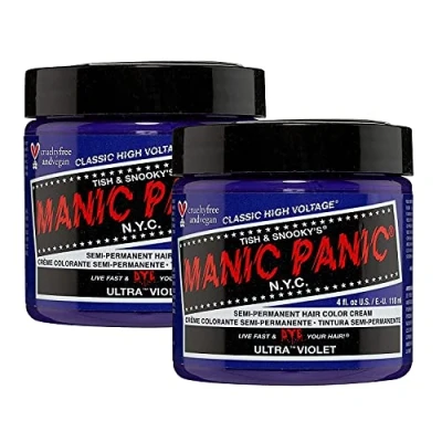 ULTRA VIOLET: Ultra Violet is a super cool, blue-toned violet dye that can even give unbleached hair violet tones. For the most vibrant results, we recommend lightening hair to very light level 9 blonde or lighter before use. MIXABLE COLOURS AND TONES: All MANIC PANIC hair colours are safe to mix to create custom shades, making the possibilities of endless shades! Combine any formula with the manic mixer/pastel-izer to create soft, on-trend pastel hues. Ready to use, no developer required. SEMI PERMANENT HAIR DYE: This semi permanent hair dye formula gradually fades in 4-6 weeks because it does not penetrate the cortex of your hair, but simply rests on top of the hair shaft. CRUELTY FREE AND VEGAN: This colour cream hair dye features vegan ingredients tested on celebrities, not animals. Made in the USA, hair colour is PPD & ammonia-free, paraben-free, gluten-free resorcinol-free, and phthalate-free. Additional FFEATURES: Benefits of Conditioning Hair, Resealable Tub For Longer Use, Comes With Instructions