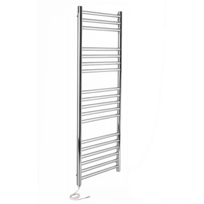 General description These designer heated towel rails are crafted from 304 grade stainless steel, ensuring durability and resistance to rust even in damp bathroom conditions. With a polished, mirror-like finish and brackets mounted on the uprights, this towel rail offers a high-end look that complements any bathroom decor while maximizing space for hanging towels. The air vent and blanking plugs are discreetly mounted on the rear of the uprights, providing a sleek appearance. For added peace of mind, these heated towel warmers come with a 10-year guarantee. Technical specifications Material: 304 grade Stainless steel Finish: Polished Upright diameter: 32mm Crossbar diameter: 22mm Heat Source: Electric Operating temperature: 65°C Guarantee: 10 years on towel rail, 2 years on element Fixings included Other information Unlike traditional electric elements that use resistance wire, this towel rail utilizes PTC elements made from ceramic stones, designed to operate at full power until