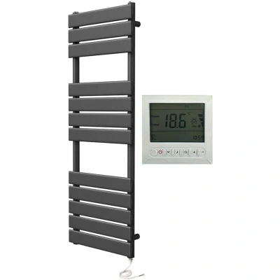 Manissa Richmond Electric Heated Towel Rail Black 500mm w x 1200mm h Flat Panel Bathroom Radiator + 7 Day Programmble Timer/Thermostat