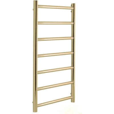 General description This luxury brushed brass heated towel rail is made from 304 grade stainless steel to prevent rusting even in damp bathroom conditions. It has a high-end look that will complement any bathroom and maximizes space available to hang towels. The brushed brass finish looks amazing in any bathroom, and the 22mm cross tubes give the rail a distinctive, sophisticated, and elegant appearance that outshines standard chrome round tube towel rails. Easy to install, this towel rail offers a beautiful finish to any bathroom and is built to last, combining durability with aesthetic appeal. Technical specifications Material: 304 grade stainless steel Finish: Brushed Brass Connection: ½" water connection Upright tube diameter: 32mm Cross tube diameter: 22mm Pressure tested to: 10 bar Certification: EN442 / CE Fixings included Valves available separately Other information This rail is tested to 10 bar, making it perfect for use with any domestic or commercial central heating system