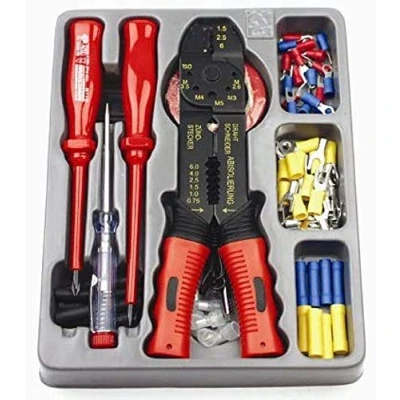 82-piece automotive electrical tool kit Includes 2 electric screwdrivers, 1 car light tester, 1 terminal crimper with cable lugs and heat shrink tubing, 1 universal hinge and more. Item Package Dimension: 28.6cm L x 18.0cm W x 3.2cm H Item Package Weight: 0.52 kg