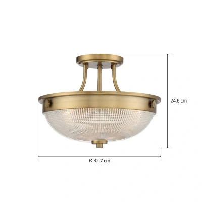 Net LightingThis classic semi-flush ceiling fitting is suitable for any style room. The semi-flush feature makes it a great choice for rooms with a lower ceiling, where it takes up less space than a pendant. This fitting is available in a choice of three different finishes; polished nickel, Palladian bronze and weathered brass. All finishes are complete with a prismatic glass dome shade. This allows the light to shine through and spread in all directions throughout the room.