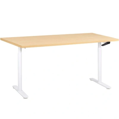 Sit and Stand Desk with Adjustable Height. This desk is equipped with a crank mechanism that allows effortless height adjustment, making the shift between sitting and standing positions smooth and comfortable. Its wide leg bases ensure proper stability, while the laminated top is easy to maintain. The combination of a melamine-coated tabletop and a strong steel frame guarantees durability and a high load capacity, making it suitable for everyday use. Details: Product Type: Adjustable Desk General Color: Brown, White Frame Colour: White Shade: Light Brown Material Type: Engineered Wood Main Material: Particle Board Additional Material: Steel Legs material: Metal Top Material: Engineered Wood Shape: Rectangular Adjustment Type: Manual Finish: Powder Coated Dimensions: Depth: 72 cm Width: 160 cm Height: 74-119 cm Weight: 35 kg Weight Capacity: 70 kg Offer Includes: 1 x Desk, Not included: Extension Cord Key Features: Easy to Use Crank Open Mechanism, Solid Workmanship, Exceptionally