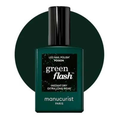 Manucurist Green Flash is the first patented* gel polish designed to strengthen and protect your nails! 12-free, plant-based, eco-friendly, and vegan, our clean gel polish cures under LED light, offering a long-lasting, non-toxic alternative to traditional gel manicures. Poison is a green glitter Green Flash gel polish. A shimmering forest green. The glittery deep green offers opaque coverage, a glittery finish, and easy application, perfect for beginners. The Green Flash nail polish range offers a high-pigment, long-lasting manicure with a professional-quality brush. It removes in 1 minute without acetone, lasts up to 10 days, and shines vibrantly. Made in France, vegan, and up to 84% bio-sourced, it’s free from endocrine disruptors. Exclusively compatible with the Green Flash semi-permanent range, it strengthens nails beneath the colour for a healthier, more durable manicure. How To Use? Easy 3-step: Step 1: Apply thin layer of Base Coat + flash it under our LED Lamp. Step 2: Apply thin layer of colour + flash it under our LED Lamp. Then repeat for second layer of colour. Step 3: Apply thin layer of Top Coat Gel Nail Polish + flash it under our LED Lamp. The removal? No drilling, no damage from Gels ! Apply a cotton pad soaked in Green Flash Remover on each nail, and hold cotton pad in place for 1 minute with our nail clips. And voilà! Made in France, Manucurist is revolutionizing the manicure experience with a range of plant-based, vegan, cruelty-free, and eco-friendly nail products and nail kit —free from harmful chemicals. Offering a wide selection of colours and product types, from cleaner semi-permanent gel to hybrid care and polish, Manucurist provides everything you need for a healthier, high-performance manicure. Manucurist nail polishes have been TPO-free since 2019 !