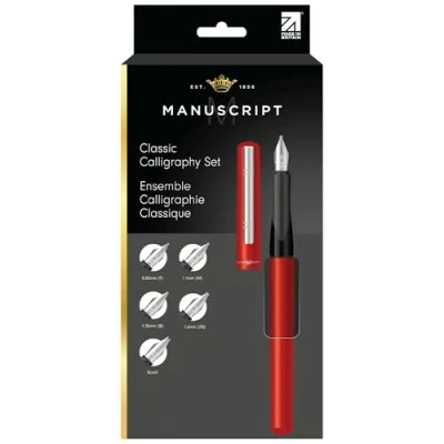 12-PIECE CALLIGRAPHY PEN SET: Ideal for fountain pen calligraphy and every day writing, this fantastic calligraphy pens set contains: 1x Classic Fountain Pen with a chrome polished detailed nib, 4x assorted standard size ink cartridges in 4 colours: black, blue, red, and green, 5x calligraphy nib sections, 1x Ink convertor and 1x Beginner's guidelines to help you get started. Packaged beautifully in a luxury gift tin. SELECTION OF NIB TYPES: Choose from: A 0.85mm left-handed italic calligraphy nib for a fine stroke, 1.1mm left-handed italic calligraphy nib for a soft italic stroke, 1.35mm left-handed italic calligraphy nib for a broad stroke, 1.6mm left-handed italic calligraphy nib for a extra broad stroke and 2.8mm left-handed italic calligraphy nib for the broadest stroke on our fountain pen nibs. All nibs come in a polished gilt finish. VERSATILE CALLIGRAPHY PENS: Use this pen set for bullet journal accessories, hand-lettered cards, art projects, elegant writing and more. A great pen gift set for adults or beginners who want to explore calligraphy in style. READY TO USE: Packaged neatly and ready to go, this calligraphy set for beginners is ideal for yourself or as a gift for others. Everything is included: nibs, ink, holder; no extra pieces of stationary required. The perfect calligraphy beginners set for handwriting enthusiasts. MANUSCRIPT: Designed and made in Britain by Manuscript Pen Company Ltd, global calligraphy specialists since 1856. Durable, reliable, and built for elegant writing. PLEASE NOTE: Packaging may vary.
