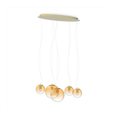 Chromed metal ceiling cap and frame. Clear blown spherical glass diffuser with chrome plating faded towards the bottom. Clear PVC cable. Color: chrome, amber, opal.