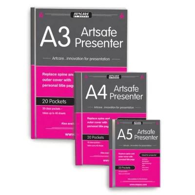 Mapac Artsafe Presenter – Clear Display Portfolio. The Mapac Artsafe Presenter is a practical and affordable solution for showcasing and protecting your artwork, documents, or creative projects. Designed with fixed clear sleeves and customizable covers, it offers a professional presentation while keeping your work secure.. Durable Construction: Made from tough polypropylene for long-lasting use.. Fixed Sleeves: Contains 20 clear, non-reflective sleeves that can display up to 40 pages when used back-to-back.. Customizable Covers: Features replaceable spine and front cover inserts for personalization.. Available Sizes: Offered in A3, A4, and A5 to suit various project needs.. Lightweight Design: Easy to carry, making it ideal for students, artists, and professionals on the go.. Ideal for presentations, portfolios, or archival storage, the Mapac Artsafe Presenter combines functionality with a sleek design to keep your work organized and protected.