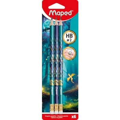 Maped 6 Graphite HB Dragon Pencils with Eraser Tip Ergonomic Triangular Shape