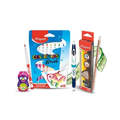 Fill your pencil case for the new school year with this premium quality maped bundle. 2 in 1 eraser and pencil sharpener in fun bright totem design (Assorted colours, cannot be specified) Double tip pen, use 2 colours simultaneously - Red Blue Black and Green ink 12 Premium quality 2H pencils, Triangular shaped for better grip and comfortable use. Unbreakable 30cm ruler made of soft playful material, Twist'n Flex can bend endlessly.