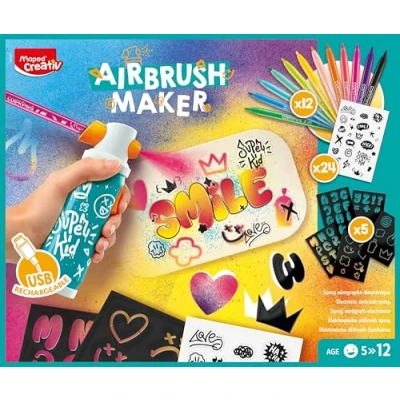 A NEW WAY TO COLOUR: The child chooses a felt, puts it into the Airbrush spray… and magic, they can make unique and original drawings and discover a new way of colouring. An incredible graffiti effect on paper! Very easy to use: Thanks to the Airbrush graffiti spray, your child will be able to use their felt tip pens more easily to create spray art. No more blowing, the Airbrush Maker is electronic! Simply insert the felt tip into the holder until it clicks and press the trigger. The tool allows the child great freedom of movement and they will be able to make amazing creations! A COMPLETE GRAFFITI KIT: Your child will become a real little graffiti artist! With the help of 5 sheets of stencils included, plus 12 Maped Jungle felt-tip pens and 24 sheets of stickers, they can tag their name on the small board or their paper sheets included in the pack. USB C/A rechargeable: The Airbrush Maker kit contains a USB C/A cable that complies with European standards to recharge the airbrush easily and quickly. You can plug it into an AC adapter. When charging, the indicator light turns red. Charging lasts about 2 hours. When it is charged, the indicator light is blue. Airbrush Maker has a minimum battery life of 1h 20m in constant use! MAPED Innovating for over 75 years for children around the world to cultivate their imaginations, develop their knowledge, learn and create with their hands. Innovative tools and sustainable school supplies specially designed for them… Day after day, Maped empowers kids to change the world with their hands!, Weight: 0.89507678372 Pounds, Manufacturer: Maped