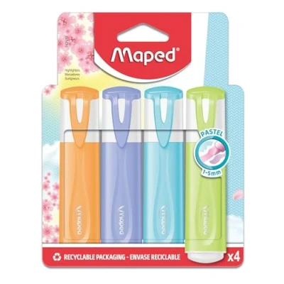 Trendy Highlights: The pastel highlighters have been specially designed with inks in the most beautiful pastel colours. With the 4-pack Maped Pastel Highlighter, you can gently highlight all your documents at home, work or school. MAPED -QUALITY: The extra soft chisel tips of the fluorescent highlighters offer unique comfort and strokes from 1 to 5 mm. These tips have been specially designed to deliver a consistent ink flow across the entire line length. You can draw fine or thick strokes as needed. Our inks are effective on all types of paper. This means that the lines are also readable when copying and/or faxing. ERGONOMIC: The body of the highlighters is designed and engineered to give you maximum comfort. In a trendy design, the Maped highlighters are ergonomic and pleasant to the eye. They fit perfectly in any pencil case or on the desk. LONG LASTING HIGHLIGHTS Since the quality of a highlighter is measured not only by the brilliance of its colors, Maped has used all its expertise to develop long-lasting highlighters. The pastel highlighters are equipped with caps that hold firmly on the pen. They do not open on their own or dry out, even if the cap is not put on immediately (up to 4 hours). MAPED : Since its founding in 1947, Maped (Manufactory of Precision and Drawing Items) has built its development on industrial know-how, innovation culture and responsiveness to provide its users with increasingly efficient and sustainable solutions. As a family business on 6 continents and in over 125 countries, Maped is today the world leader in school and office supplies.