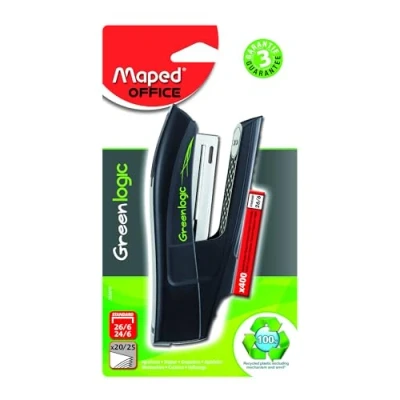AmazonDurable pocket-size stapler Made from post consumer recycled plastic material (except stapling mechanism) Comes with a box of staples Stapling depth of 43 mm