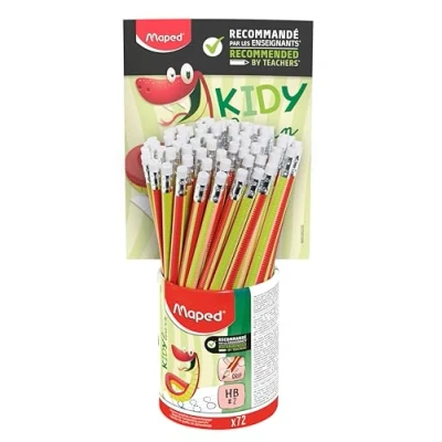 HB LEARNING PENCILS: This pack contains 2 HB graphite pencils with eraser tip, designed for children who are gradually becoming familiar with the handling of the pencil. The body is textured and evokes the snake's skin, for better finger grip. The ergonomic triangular shape promotes better grip. The colorful, cheerful and fun edge helps guide finger positioning. It is recommended by 80% of teachers. Eraser tip: Children will no longer have to wonder where their eraser went. Pencils with eraser tips are essential school supplies for children! HB lead: HB for Hard Black qualifies a standard lead hardness suitable for flexible writing and drawing. This durable, easy to cut lead is ideal for children! The medium hardness of HB Maped leads allows good erasing with eraser while preserving the quality of paper or drawing. THE RANGE TO LEARN WITH FUN: The Kidy Learn collection includes all the essential tools to learn how to write, trace, cut out... Designed for the little hands of young children, this collection is a real invitation to learn. Each product is associated with a small totem animal, as a little learning companion for the child. CHANGING THE WORLD WITH HER HANDS: Maped has been innovating for over 75 years for children around the world to cultivate their imaginations, develop their knowledge, learn and create with their hands. Innovative tools and sustainable school supplies specifically designed for them… Day after day, Maped empowers children to change the world with their hands!
