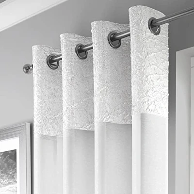 Voile Curtain Panel Available in Three Sizes Sold as Single or Pair 100% Polyester Cool/Delicate Wash Cycle or Hand Wash Eyelet Ring Top Heading Suitable for Curtain Poles Each Panel is approximately 55" Wide 140cm To hang on a Curtain Pole Suitable for Living Room, Lounge, Bedroom Soft Linen Look with Crushed Satin Top Heading