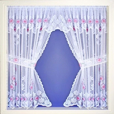 A Pretty Daisy Purple and Lilac marigold flowered net Curtain Slotted ready for a wire or net rod Machine washable cool wash Attached Pelmet Tie Backs Included ideal for kitchen and bathrooms Approximate Measurements 106" (274cm) Width x 36"(91cm) Drop Net Curtains Ideal for reducing glare and heat from the sunshine through your windows
