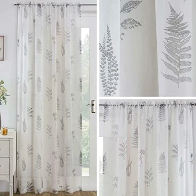 Maple Textiles Ivory Cream Jungle Fern Leaf Floral Design Slot Top Sheer Voile Curtain Window Single Panel (Grey, 48" (122cm) Drop)