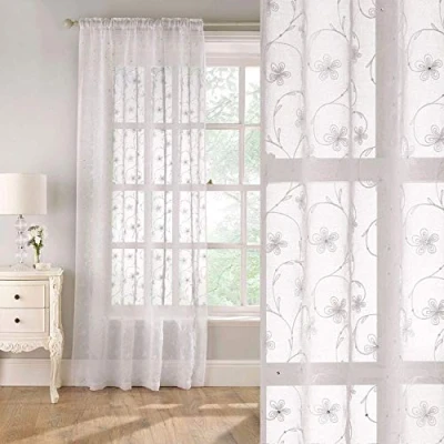 Sparkle Silver Sequin embroidered floral design on a linen look feel background Sold in Single panels each panel measures approximatley 55"(140cm) Width x 72"(183cm) Drop 100% Polyester Delicate Wash Cool Iron on Reverse Slot Top Heading to hang on a Thin Curtain pole, net rod or wire Available in White Cream and Grey
