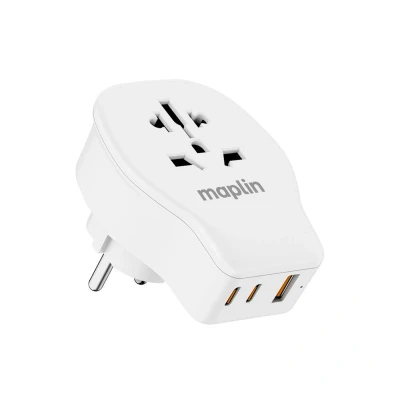 - The Maplin plug adapter is your go-to travel buddy - it works in UK, EU, US, Asia and Australia - You can juice up your phone or tablet easily with its 20 W of power - With 1 x USB and 2 x USB Type-C ports, you can charge up to 3 gadgets at the same time - Its built-in overload, short-circuit and temperature protection keeps your devices safe - It comes with a handy pouch, so you could take it around easily wherever you go__________________Please note: EU adapter is designed for Type E/F European grounded sockets found in Germany, France, Spain and the Netherlands. Provides a safe, earthed connection in line with UKCA safety requirements. Not compatible with smaller ungrounded Type C sockets still used in parts of Italy, Switzerland and older buildings in Europe.